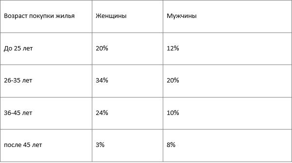 По данным ГК «ТОЧНО», женщины покупают собственное жилье гораздо раньше мужчин: 20% — в возрасте до 25 лет, треть — от 26 до 35 лет. Для наглядности приведем данные в таблице.